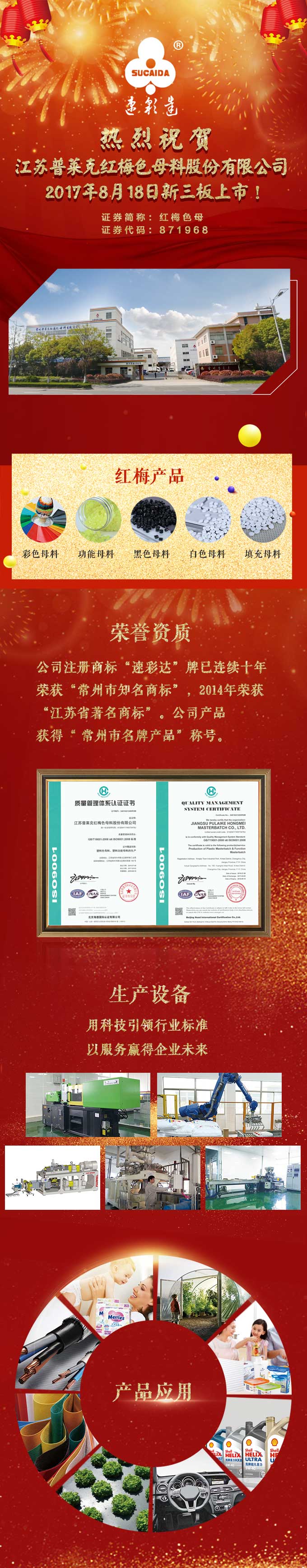 江蘇普萊克紅梅色母料股份有限公司于2017年8月18日在全國中小企業股份轉讓系統(新三板)正式掛牌交易。